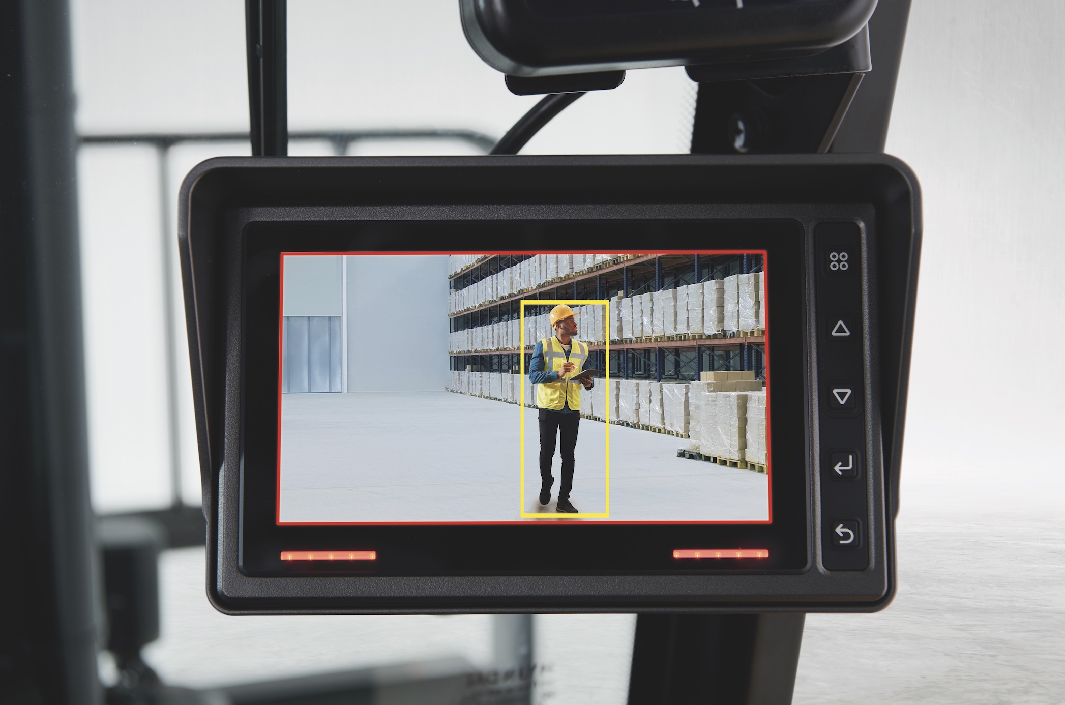 La cabine, plus silencieuse et moins sujette aux vibrations, offre un environnement de conduite confortable. Les chariots intègrent plusieurs fonctions d’assistance : freinage régénératif, système anti-recul, modes de conduite adaptables (High / Normal / Eco) et options de sécurité comme la détection de piétons et de charge ou l’éclairage Blue Spot / Red Zone.