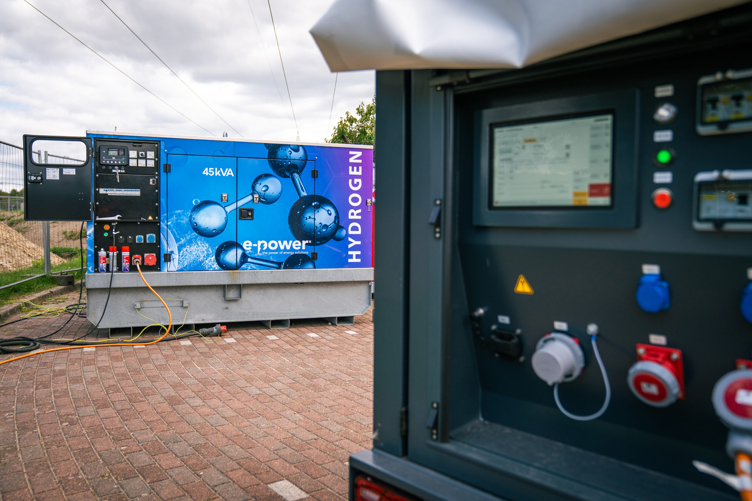 Au cœur de l’opération, deux machines Liebherr, la chargeuse sur pneus L 507 E et la pelle sur pneus A 916 E, accomplissent leurs tâches avec la même puissance que les modèles diesel, mais sans CO₂ ni bruit. L’alimentation est assurée par le système de stockage d’énergie LPO 100 et un générateur à hydrogène mobile, offrant une autonomie complète, même hors réseau.