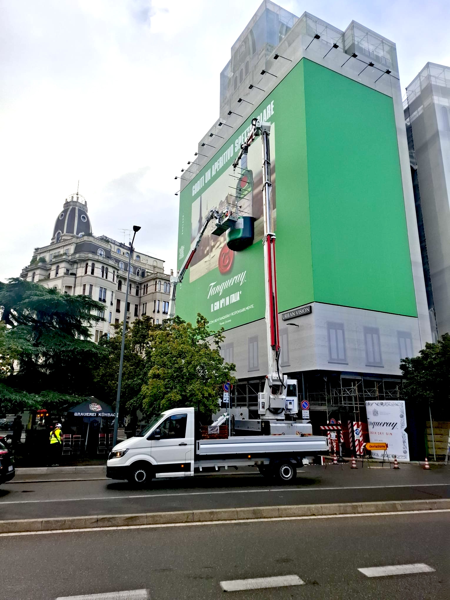 À Milan, sur la Piazza Piemonte, AMIP SRL a réalisé pour Urban Vision Group une installation visuelle d’envergure autour de la marque Tanqueray. L’entreprise a érigé une structure autoportante recouverte d’une affiche 3D représentant une bouteille du célèbre gin, intégrant éclairage et dispositifs de sécurité pour les piétons.