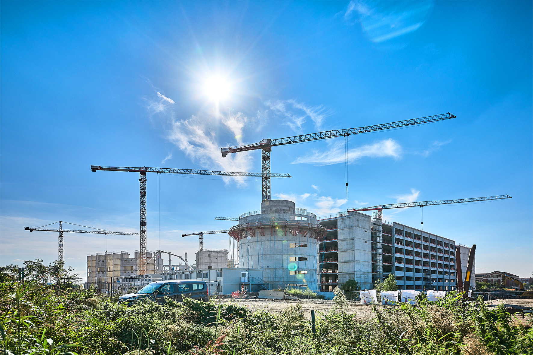 À Milan, les grues Liebherr participent à l’édification de l’ARENA MILANO, futur site phare des compétitions de hockey sur glace. Six grues, dont les modèles 340 EC-B, 370 EC-B 12 Fibre, 280 EC-H, deux 205 EC-B et une 285 EC-B, opèrent sur ce chantier où l’espace est particulièrement restreint.