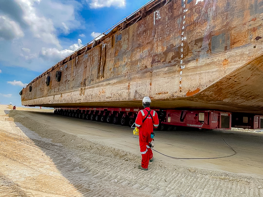 Arrivée sur la zone sèche, la barge était stabilisée grâce à 18 vérins hydrauliques. Cette opération permettait de dégager les airbags et de créer l’espace nécessaire pour insérer les SPMT. Ces modules autopropulsés, configurables en plusieurs essieux, assuraient le transport du navire jusqu’à la rampe de lancement située à la digue.