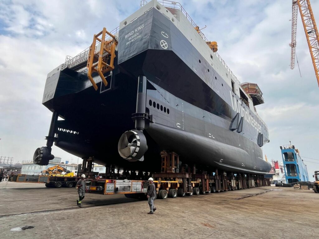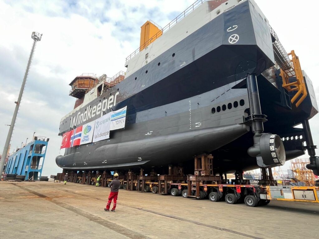 En Turquie, le navire a été déplacé sur 72 essieux SPMT, puis tourné de 90 degrés avant d’être aligné avec exactitude. Chaque mouvement a été planifié dans le moindre détail par HAREKET, spécialiste du levage industriel et du transport de charges lourdes, pour assurer un transfert sûr et sans incident.