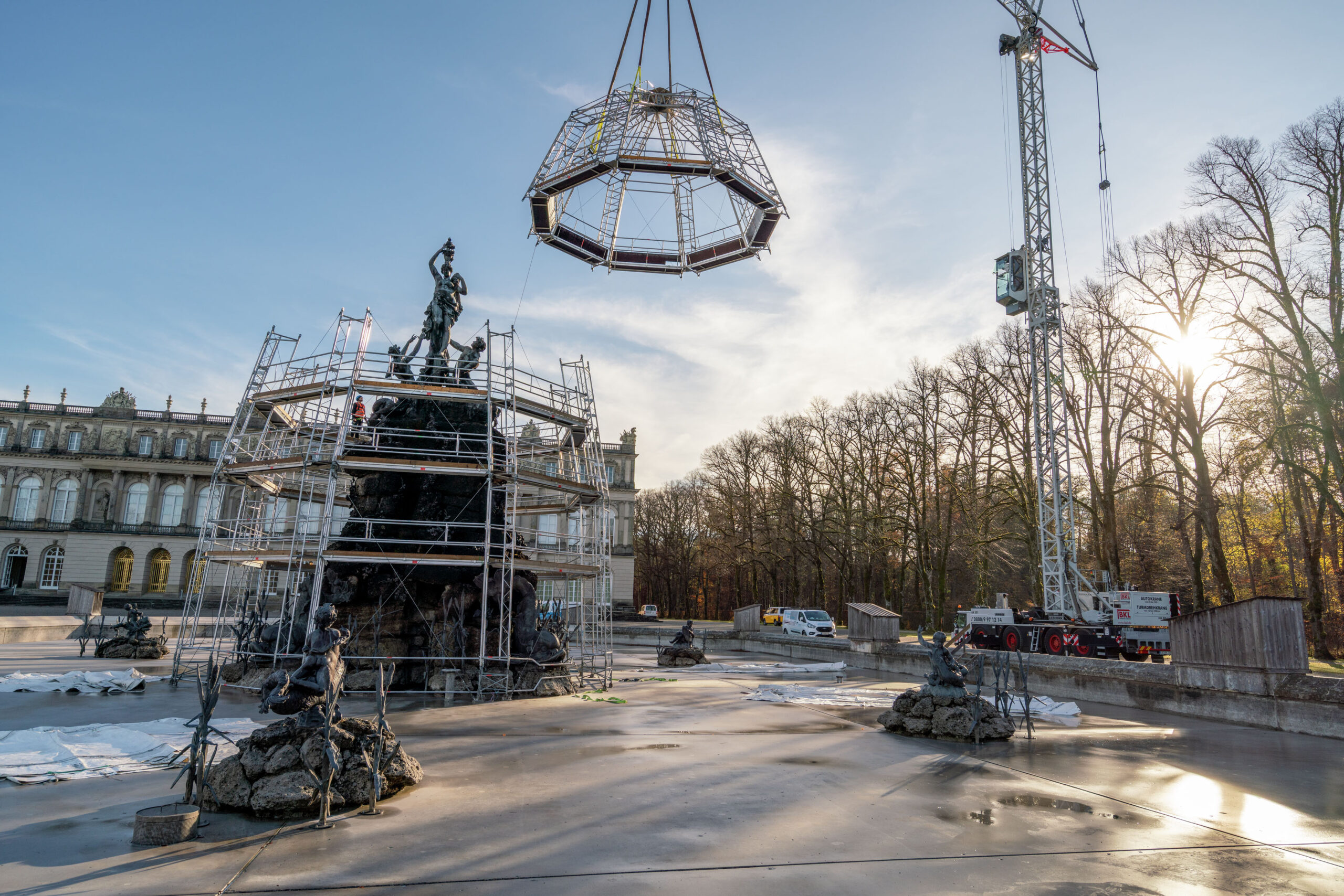 Sur l’île d’Herreninsel, au cœur du lac Chiemsee, une opération saisonnière mobilise chaque année des moyens de levage spécifiques. Avant l’hiver, les fontaines monumentales du parc du Château de Herrenchiemsee sont protégées par des structures d’échafaudage recouvertes de bâches.